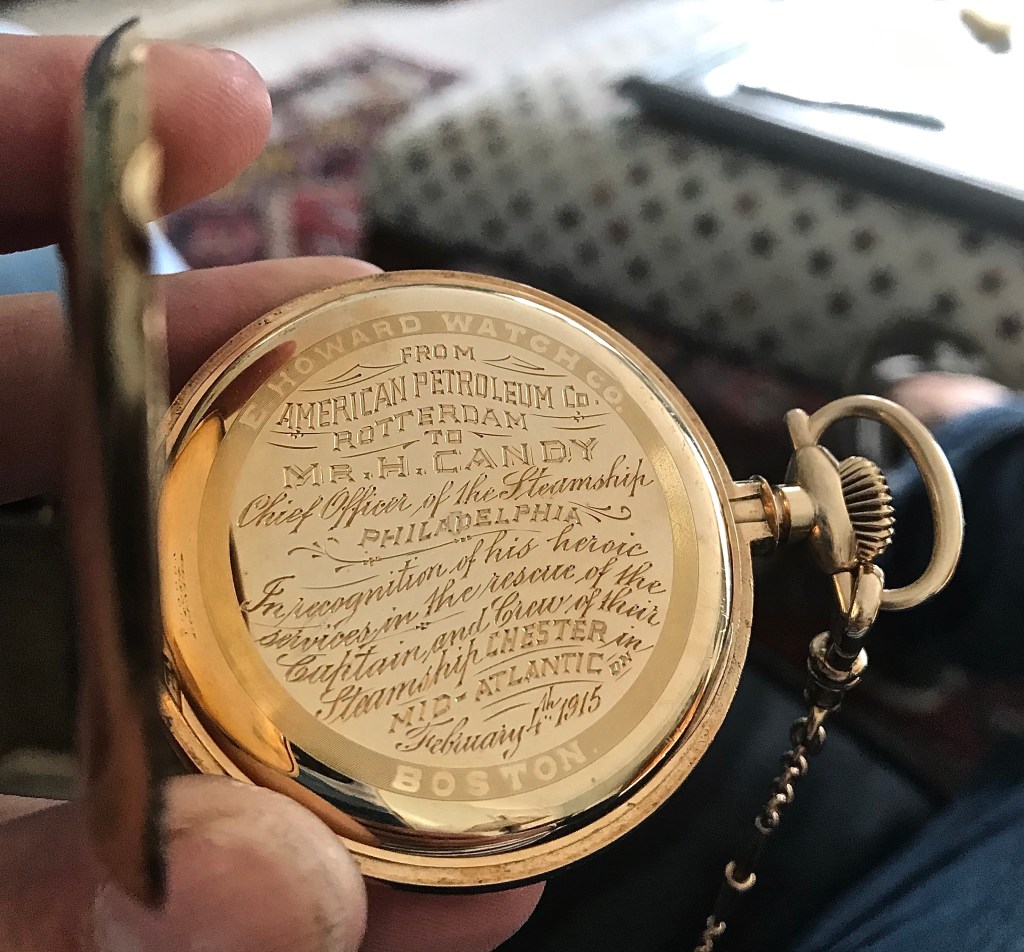 He was Chief Officer of the SS Philadelphia, a passenger liner that regularly crossed the Atlantic in the early 20th Century. In February 1915, he came to the rescue of the Captain and Crew of the SS Chester, a tanker owned by the American Petroleum Company which, having been badly damaged in heavy weather, was sinking. He led a lifeboat of six volunteer seamen from the Philadelphia to save 22 out of the 33 men on board the Chester. A second boat then launched to pick up the remaining 11; no lives were lost – remarkable in the horrendous conditions. In gratitude and recognition of his heroic action, the company awarded him the gold pocket watch. An account of the rescue was carried in the New York Times. I love to think that the watch is in his top pocket in the picture above.